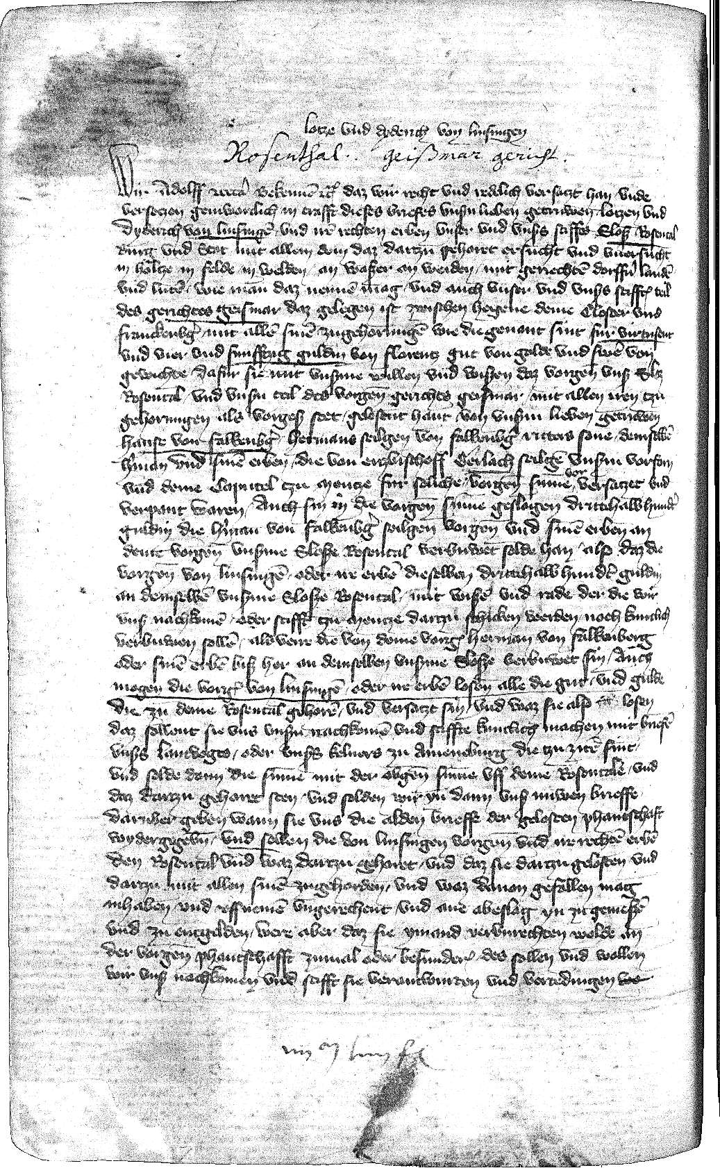 Erzbischof Adolf I. versetzt Lotze und Dietrich von Linsingen und deren Erben die erzbischöfliche bzw. erzstiftische Burg Rosenthal, Burg und Stadt, mit allem Zubehör sowie den erzbischöflichen Teil des Gerichts Geismar. [Der Mainzer Erzbischof] Adolf versetzt kraft dieser Urkunde seinen "lieben Getreuen" Lotze und Dietrich (Dyderich) von Linsingen (Linsinge(n)) und deren Erben die erzbischöfliche bzw. erzstiftische Burg (sloß) Rosenthal (Rosental), Burg und Stadt, mit allem Zubehör, dazu den erzbischöflichen Teil des Gerichts Geismar, zwischen Kloster Haina (Hegen) und Frankenberg (Franckenberg) gelegen, samt Zubehör für 4.054 Florentiner (von Florentz) Goldgulden. Für diesen Betrag hatten die Herren von Linsingen das Gut von Ritter Hans von Falkenberg (Falkenb(er)g), Sohn des verstorbenen Herman von Falkenberg, gelöst. Den Falkenbergern war das Gut für diese Summe von Adolfs Amtsvorgänger Erzbischof Gerlach verpfändet worden. In der Pfandsumme waren 250 Gulden enthalten, die Herman von Falkenberg und seine Erben an der Burg verbauen sollten. Dies sollen die Herren von Linsingen ebenfalls tun. Die Herren von Linsingen können verpfändete Güter innerhalb des Pfandgutes lösen, müssen dies aber schriftlich dem Landvogt oder dem erzbischöflichen Keller in Amöneburg (Ameneburg) [Walprecht von Selheim] mitteilen. Die Aufwendungen werden dann auf die Pfandsumme geschlagen. Der Erzbischof wird dies schriftlich bestätigen, sobald ihm die Verpfändungsurkunden der gelösten Güter überantwortet worden sind. Alle Einnahmen des Pfandgutes, auch die der eventuell gelösten Pfandgüter, stehen uneingeschränkt den Herren von Linsingen zu. Sie brauchen darüber keine Rechnung abzulegen. Sollte sie jemand im Gut verunrechten, wird der Erzbischof sie dann rechtlich in der Weise verantwurten und vertedingen, als wäre es Eigengut. Die Herren von Linsingen dürfen sich aus Burg Rosenthal heraus und in die Burg hinein zu allen Notwenigkeiten behelfen, das Öffnungsrecht gilt auch für alle anderen erzstiftischen Burgen. Burg Rosenthal bleibt aber uneingeschränkt erzstiftisches Offenhaus. Sollte die Burg in erzstiftischen Kriegen verloren gehen, muss Mainz die Pfandsumme zurückzahlen und die Herren von Linsingen in anderes erzstiftisches Gut setzen, damit sie ihres Pfandgeldes sicher sind. Die Herren von Linsingen müssen die Burgmannen, Bürger und Leute zu Rosenthal und im Gericht Geismar bei ihren Freiheiten, Gewohnheiten und Rechten belassen und dürfen sie nicht zu irgendwelchen Leistungen zwingen. Sie dürfen die zugehörigen Wälder nicht verwüsten oder roden (verhauwen). Sie sollen das Kloster Haina (Hegene) und seinen Besitz schirmen und schützen und bei seinen Freiheiten und Rechten belassen. Das Pfandgut darf von Mainz nur als Ganzes gelöst werden. Der Lösungswunsch muss einen Monat vorher angekündigt werden. Nach Ablauf dieses Monats müssen Burg und Gericht samt Zubehör zur Lösung freigegeben werden. Das Lösungsgeld ist wahlweise in Fritzlar oder Amöneburg (Ameneburg) zurückzuzahlen und wird den Herren von Linsingen auf Wunsch zwei Meilen weit vom Lösungsort aus geleitet. Will Mainz oder der erzstiftische Landvogt in den Teichen fischen, die zu Rosenthal gehören, dürfen die Fischer, die eine schriftliche Bestätigung des Erzbischofs vorweisen müssen, daran nicht gehindert werden. Der Erzbischof kündigt sein Siegel an. - Datum Ameneburg in crastino sociorum Philippi et Jacobi apostolorum ... 1385.