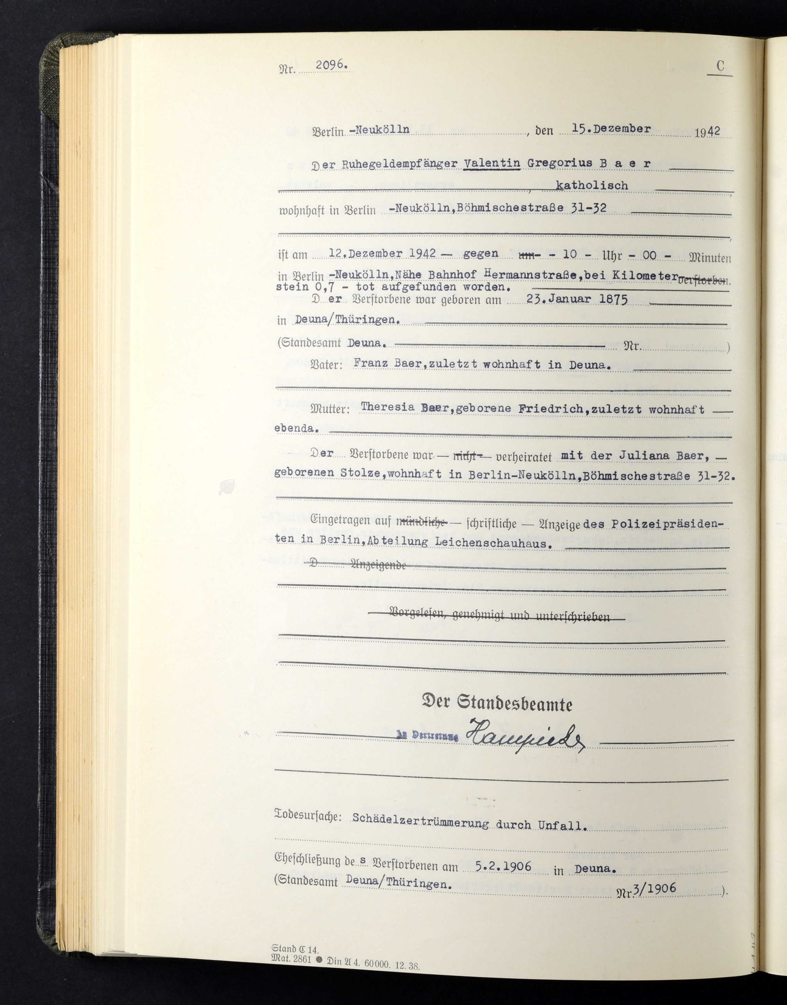 Valentin Gregorius Baer *23.01.1875 in Deuna mit Namen "Bär", +12.12.1942 in Berlin und