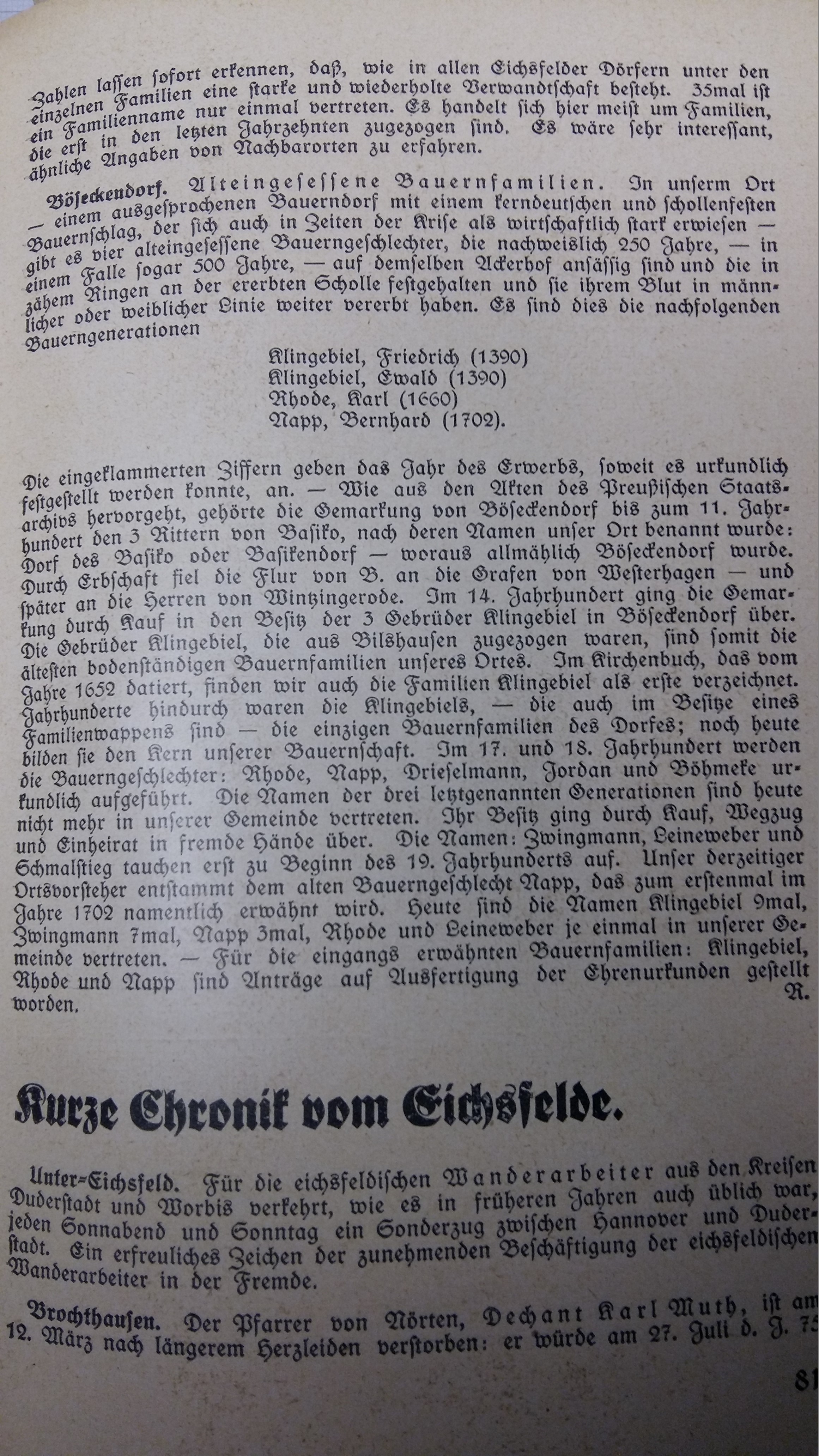 ich suche einen Artikel aus "Unser Eichsfeld", Jahrgang 1934, Seite 81(?). Es geht hier um Böseckendorf und frühe Einwohner, z.B. 2 Brüder Klingebiel mit der Jahreszahl 1390.