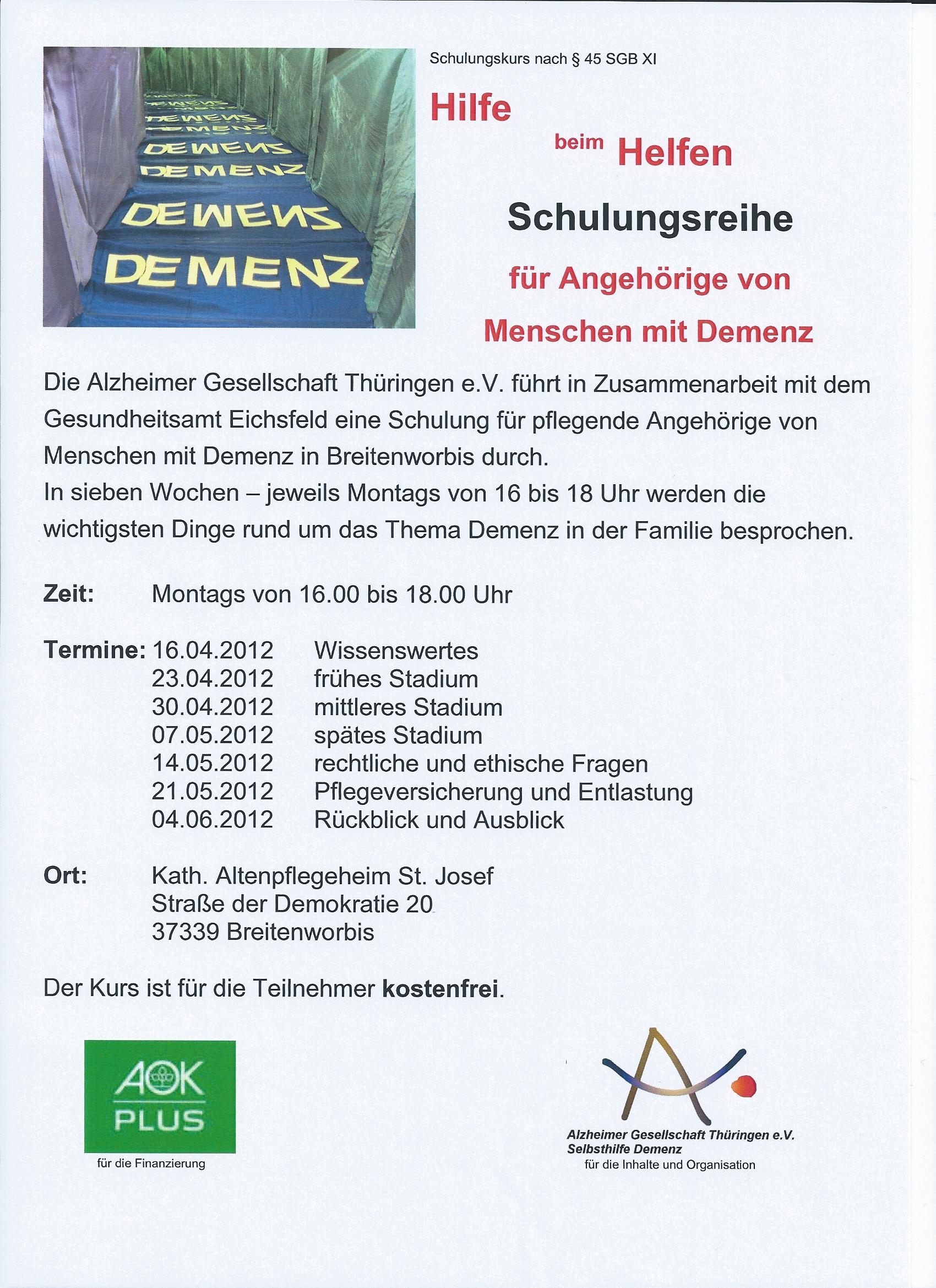 wie bereits veröffentlicht, beginnt am 16. April um 16.00 Uhr im Altenpflegeheim St. Josef in Breitenworbis die Schulungsreihe zum Thema Demenz.
